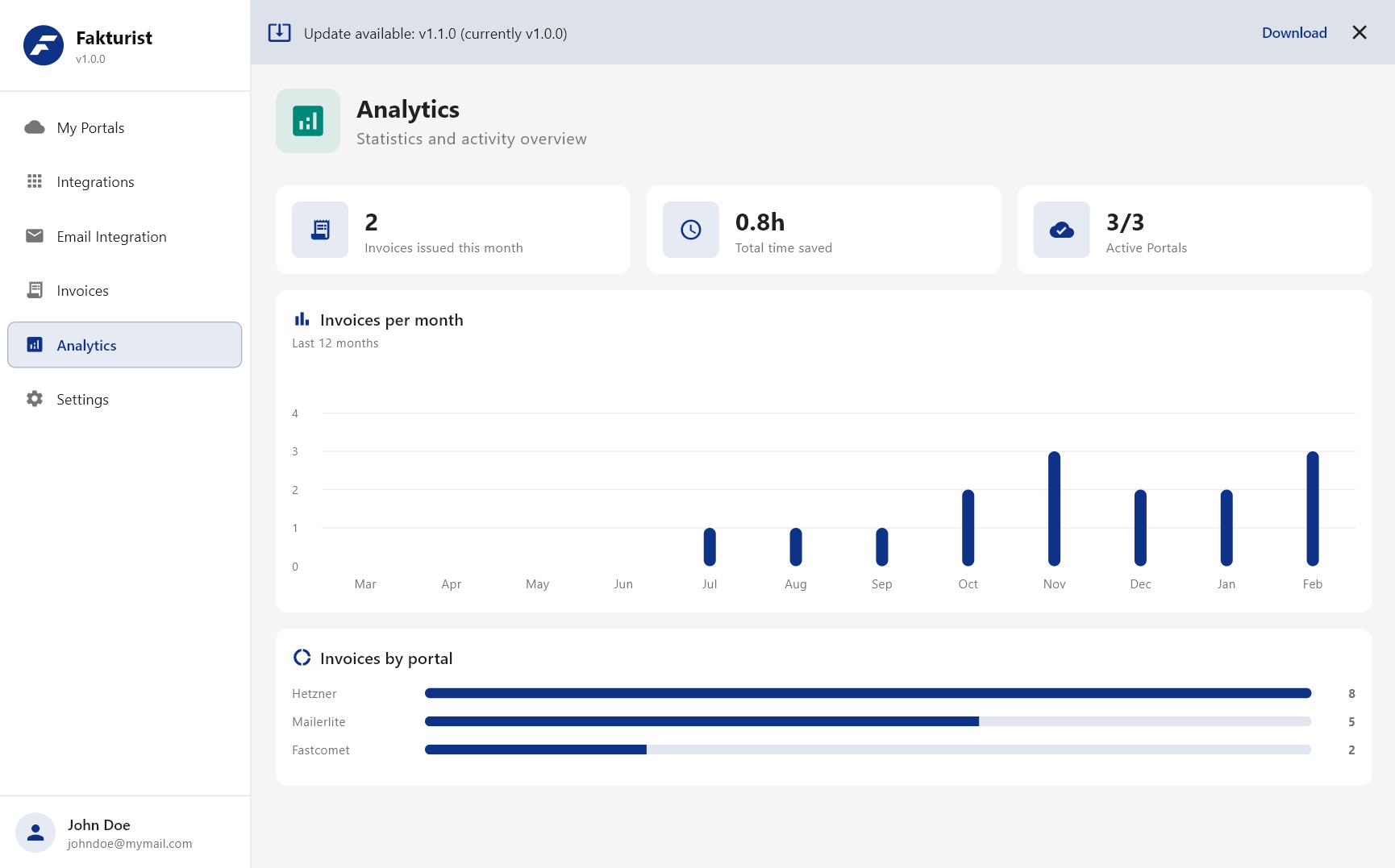 Track invoices per month, time saved, and portal distribution with interactive charts.